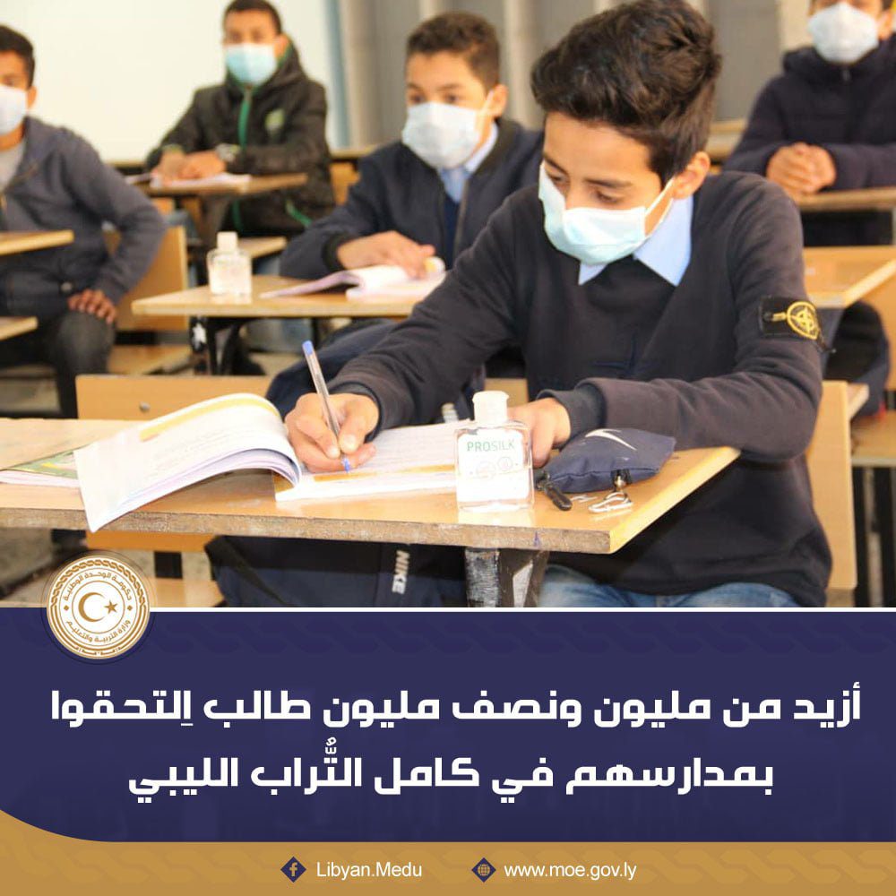لتحق مليون و599 ألف و466 طالب وطالبة بمقاعد الدراسة التي تتواصل بشكل فعلي للأسبوع الثاني على التوالي في كافّة المُؤسسات التعليمية في كامل التُّراب الليبي.