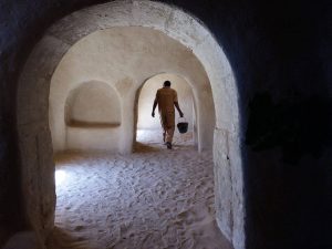 وأكمل السنوسي حديثه عن المسجد واصفا إياه من الداخل “يتم الدخول إلي هذا المسجد من الناحية الشرقية حيث توجد على يمين الداخل غرفة استخدمت لحفظ المصاحف وجلوس أمام المسجد قبل خطبة الجمعة، ويتكون بيت الصلاة من خمس بلاطات موازية لجدار القبلة وهذه البلاطات مقسمة من الداخل بواسطة مربعات تفتح على بعضها البعض بواسطة عقود نصف دائرية وهذه العقود بدورها تحمل القباب المخروطية والسطح ، كما ويوجد خلف بيت الصلاة صحن متسع يتم الدخول إليه من المدخل الجنوبي ومدخل آخر عبر البلاطتين الرابعة والخامسة .