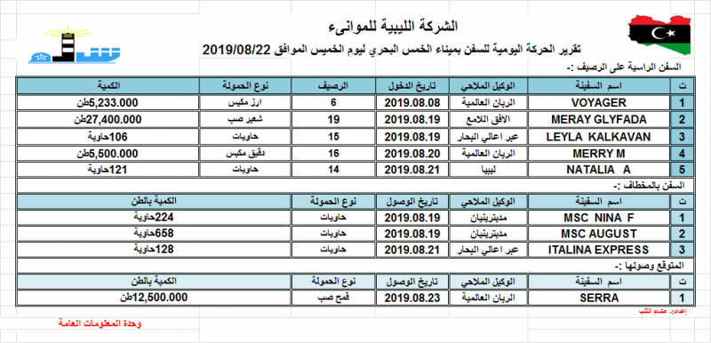 وبمدينة الخمس فقد رست على رصيف ميناء المدينة خمس سفن تنوعت حمولتها مابين ” أرز مكيس – شعير صب – حاويات – دقيق مكيس ” فيما دخلت ” المخطاف ” ثلاث سفن تحمل جميعها حاويات سلع وبضائع متنوعة .