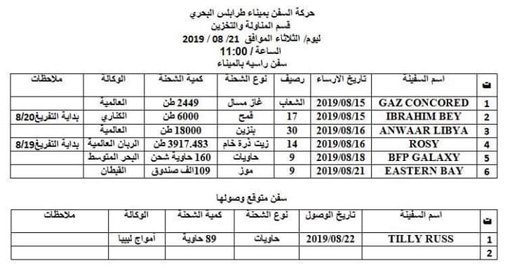 وبميناء طرابلس رست سبع سفن ، تحمل الأولى على متنها 2449 طن من الغاز المسال ، وتحمل الثانية 6000 طن من القمح ، وتحمل الثالثة 18000 طن من مادة البنزين ، وتحمل الرابعة 3917.483 طن من زيت الذرة الخام ، وتحمل الخامسة على متنها 160 حاوية ، فيما كانت حمولة السفينة السادسة 109000صندوق من الموز . أما حمولة السفينة السابعة فكانت 89 حاوية بضائع وسلع مختلفة .