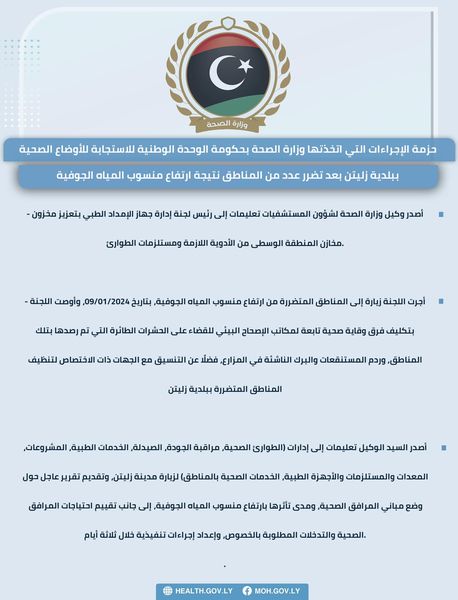 #حزمة_الإجراءات التي اتخذتها وزارة الصحة بحكومة الوحدة الوطنية، للاستجابة للأوضاع الصحية ببلدية زليتن بعد تضرر عدد من المناطق نتيجة ارتفاع منسوب المياه الجوفية: