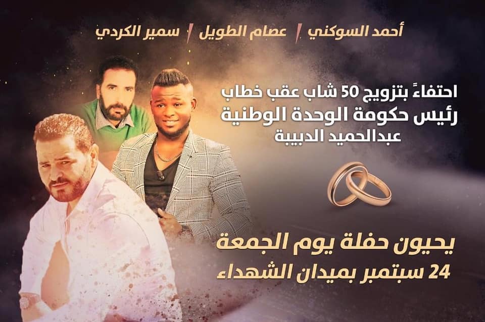 اقيم الليلة بميدان الشهداء بالعاصمة طرابلس حفل فنى ساهر احتفاء بالشباب الليبي وبعقد قران بعضا منهم من الذين استفادوا بمنح مبادرة دعم الزواج .