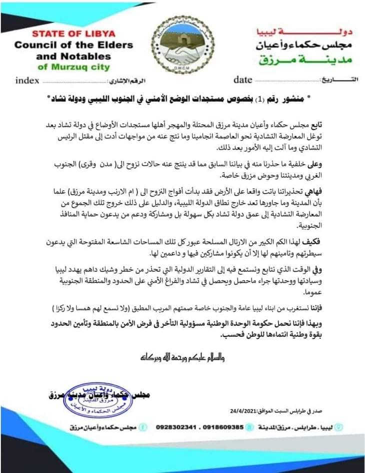 فهاهي تحذيراتنا باتت واقعا على الأرض فقد بدأت أفواج النزوح الى ( ام الارنب ومدينة مرزق) علما بأن المدينة وما جاورها تعد خارج نطاق الدولة الليبية، والدليل على ذلك خروج تلك الجموع من المعارضة التشادية إلى عمق دولة تشاد بكل سهولة بل ومشاركة ودعم من يدعون حماية المنافذ الجنوبية.