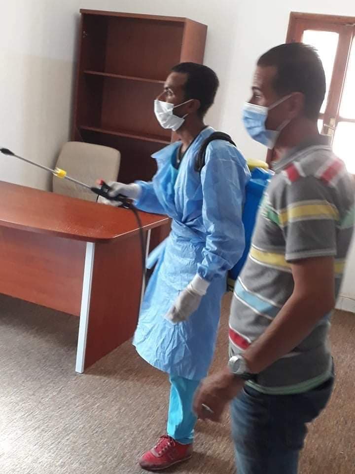 خبر في سياق تعقيم مرافق مؤسسات القطاع العام من أجل مكافحة جائحة فيروس كورونا … تم الخميس الماضي 2020.8.13م تعقيم وتطهير مقر فرع الشؤون الاجتماعية بسوق الجمعة . يأتي برنامج هذا التعقيم والتطهير للمقر للمرة الثانية بفضل الله أولا ثم بفضل مجهودات قام بها كل من السيد رئيس فرع الشؤون الاجتماعية سوق الجمعة عبد المنعم دوزان والموظف بالفرع السيد ناصر هويدي .