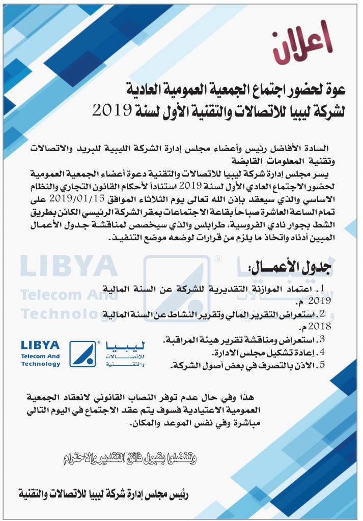 دعوة لأعضاء لحضور اجتماع الجمعية العمومية لشركة ليبيا للاتصالات والتقنية الأول لسنة 2019