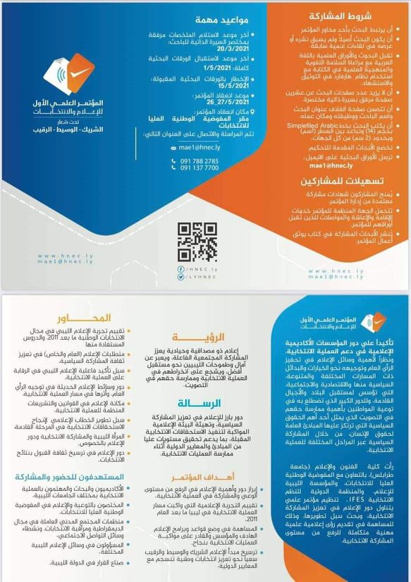 اللجنة التحضيرية للمؤتمر العلمي الأول للإعلام والإنتخابات تعلن عن فتح باب المشاركة في المؤتمر بالإطلاع على محاور وشروط المشاركة في المؤتمر ومراسلتها على الإيميل المبين بالمطوية المرفقة .