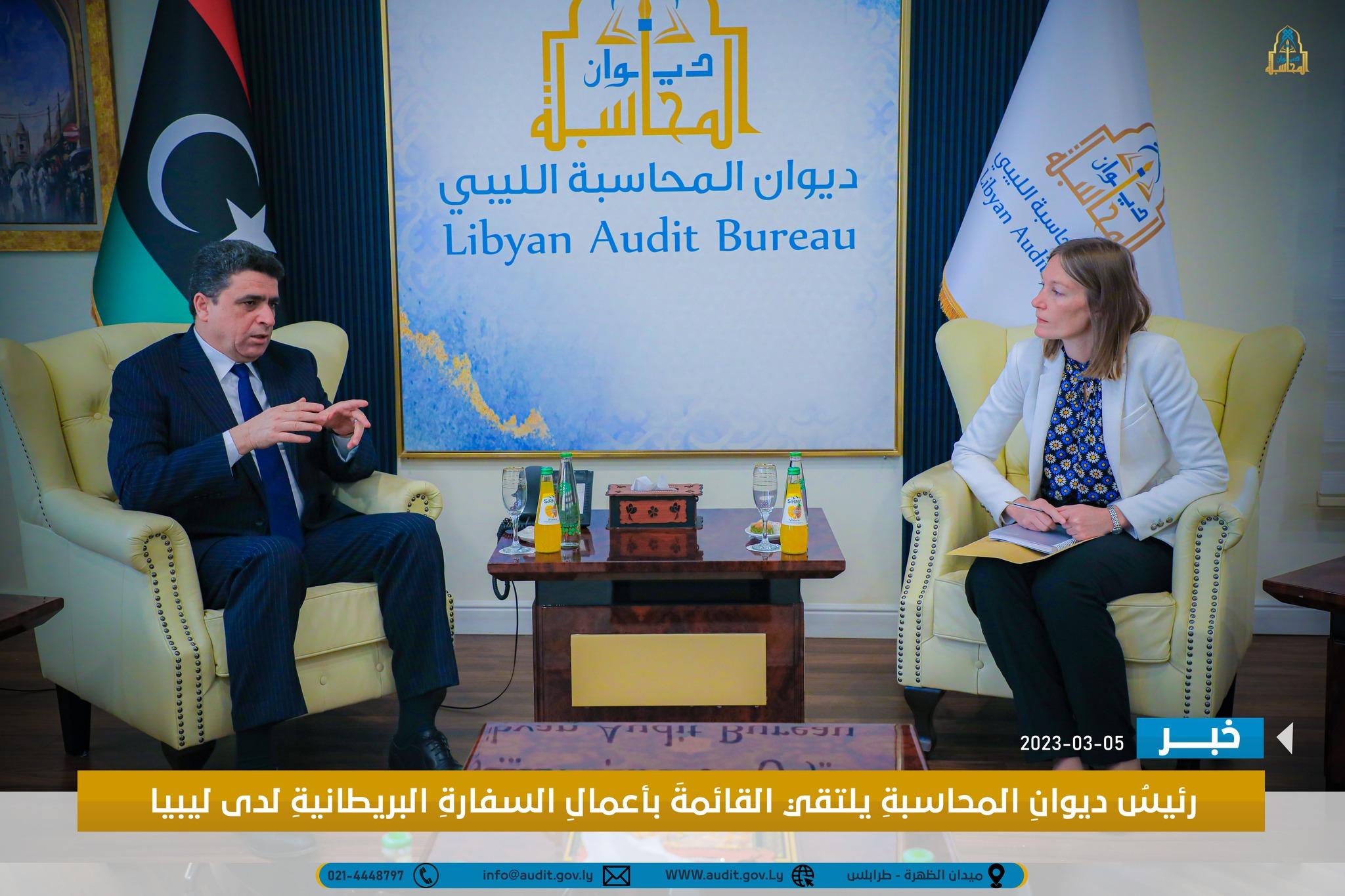 تركز لقاء رئيس دِيوان المحاسبة ” خَالد شكشك ” مع القائمة بِأعْمَال السِّفارة البريطانيَّة فِي لِيبيَا ” كاثرين وايلد ” أمس الأحد على مناقشة العدِيد مِن الملفَّات الهامَّة فِي إِطَار سَعْي الدِّيوان لِتحْقِيق رِقابة فَعَّالة على المال العام، ومن بينها العقْد الموقع مع مَكتَب المحاسبة اَلدوْلِي الإنْجليزيِّ ( أر . اس . أم ) لمُرَاجعَة بَعْض الاسْتثْمارات اللّيبية بِالْممْلكة المتَّحدة، والتَّحْضير لِتعاقد مع ذات المكْتب لِمراجعة بَعْض الملفَّات الخاصة بِقطاع النِّفْط .