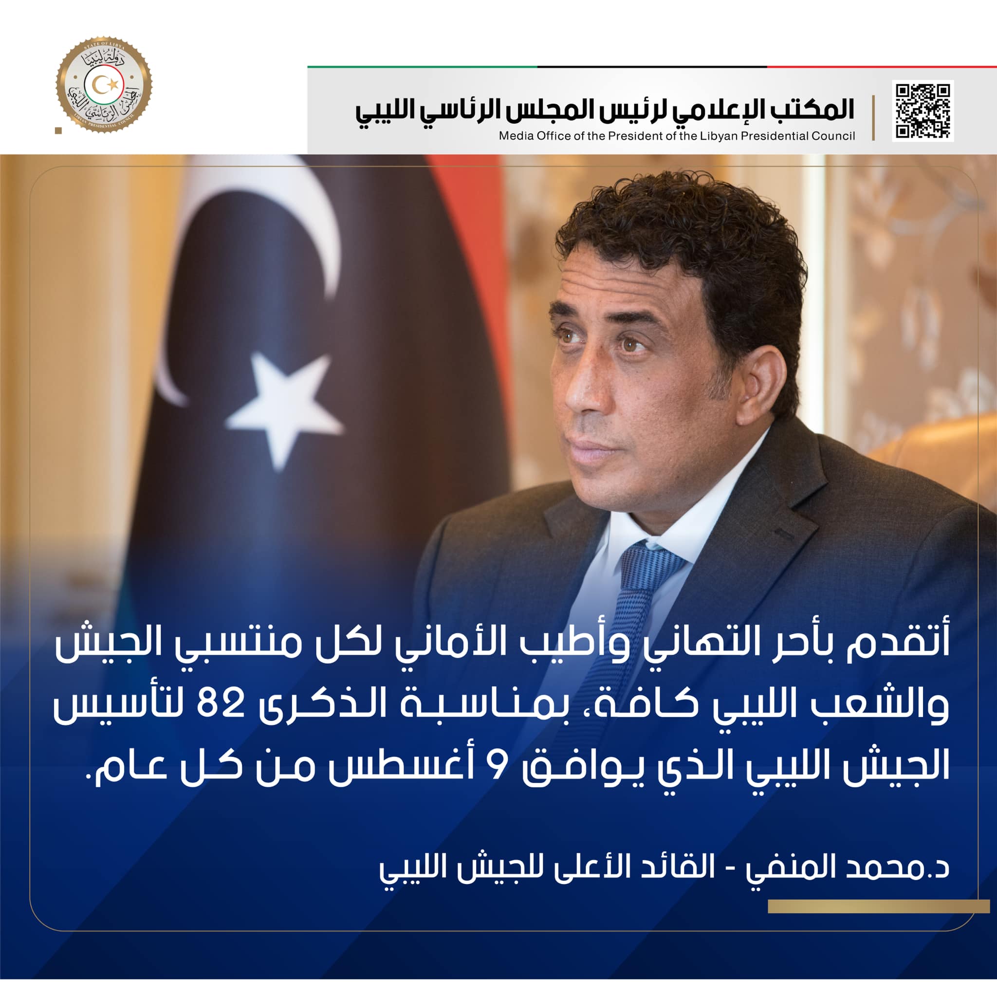 هنأ رئيس المجلس الرئاسي القائد الاعلى للجيش الليبي ” محمد المنفي ” منتسبي الجيش والشعب الليبي كافة بمناسبة الذكرى 82 لتأسيس الجيش الليبي الذي يوافق 9 من شهر اغسطس من كل عام