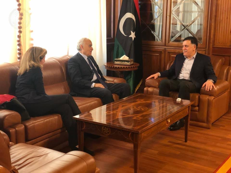 اجتمع رئيس المجلس الرئاسي لحكومة الوفاق الوطني السيد فائز السراج اليوم السبت بمقر المجلس بالعاصمة طرابلس مع كل من رئيس بعثة الأمم المتحدة للدعم في ليبيا السيد غسان سلامة، ونائبته للشؤون السياسية السفيرة ستيفاني ت. ويليامز. وتناول الاجتماع مستجدات الأوضاع حول العاصمة وجهود الأمم المتحدة لوقف الاعتداءات. حيث أكد السيد الرئيس أن القوات التابعة لخليفة حفتر مازالت مستمرة في استخدام الطيران والقصف العشوائي لمناطق مدنية تشمل البيوت والبنية التحتية، وكان آخرها قصف مدرسة بمنطقة عين زارة هذا اليوم، كما أبلغ سيادته المبعوث الأشممي بحالات لانتهاك حقوق الإنسان من قبل القوة المعتدية من بينها تجنيد الأطفال للقتال في صفوفها. من جانبه أكد السيد غسان سلامه رفضه التام لأي اعتداء على المدنيين والمنشآت المدنية الذي يشكل انتهاكاً خطيراً للقانون الإنساني الدولي، مؤكداً أن الجهود لم تتوقف لإنهاء هذه الحرب.