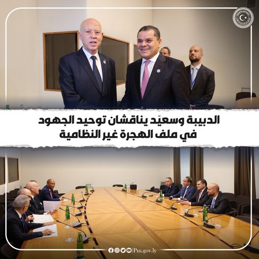بحث رئيس حكومة الوحدة الوطنية #عبدالحميد_الدبيبة مع الرئيس التونسي قيس سعيد، ملف الهجرة غير النظامية، وسبل توحيد الجهود في مواجهة تدفقات المهاجرين.