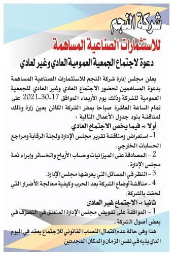 يعلن مجلس إدارة شركة النجم للاستثمارات الصناعية المساهمة بدعوة المساهمين لحضور الاجتماع العادي وغير العادي للجمعية العمومية للشركة وذلك يوم الأربعاء الموافق 17-30-2021 على تمام الساعة العاشرة صباحا بمقر الشركة الكائن بعين زارة وذلك لمناقشة بنود جدول الأعمال التالية :.