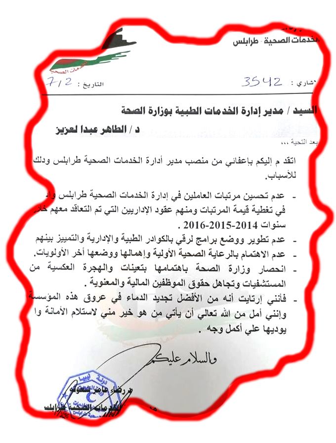 قدم مدير إدارة الخدمات الصحية طرابلس الدكتور ” رضاء عامر شعوته” اعفائه من مهام الإدارة وفق كتاب موجه لمدير إدارة الشؤون الطبية بوزارة الصحة الدكتور” الطاهر عبدالعزيز”، مبررا الإعفاء لعدم قيام الوزارة والجهات ذات العلاقة بالإفراج على مرتبات العاملين في الإدارة من فئة الإداريين المتعاقدة معهم إدارة الخدمات من العام “2014”، وعدم وضع برامج لتنمية الموارد البشرية للرفع من قدراتهم المهنية .