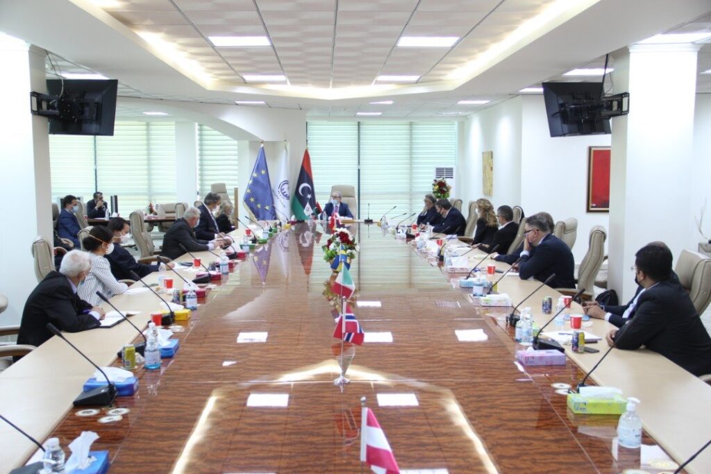 خلال لقائه يوم السبت الماضي الموافق 10 اكتوبر 2020 بسفراء دول الاتحاد الاوروبي ( إيطاليا، والدنمارك، والسويد، والنمسا، وبلجيكا، واسبانيا، والنرويج، وفنلندا، وبولندا، وهولندا، والمجر ) بمقر المؤسسة الوطنية للنفط) بالعاصمة الليبية طرابلس .