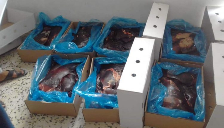 ففي مدينة زليتن قام مفتشو مركز الرقابة على الأغذية والأدوية بالمدينة , بحملة تفتيشية بالتعاون مع قسم مكافحة التهريب والمخدرات وجهاز الحرس البلدي زليتن . وتم خلال الحملة ضبط حاويات مبردة ( 40 قدم ) تم منحها إفراجاً جمركياً من ميناء الخمس على أنها شحنة تفاح طازج , وأثناء الكشف اتضح أن الشحنة تحتوي على لحوم أبقار غير صالحة للاستهلاك البشري , وكمية كبيرة من كبد الأبقار المحظور دخولها .