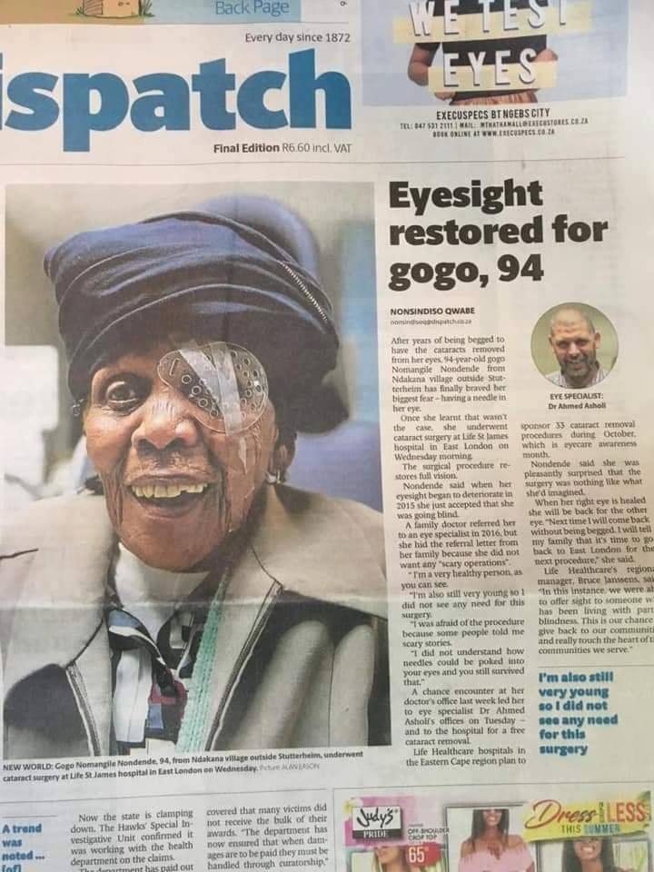 أشادت الصحافة الجنوب افريقية في شهر أكتوبر الماضي بالعملية الجراحية الناجحة التي أجراها الطبيب الليبي الدكتور” أحمد السهولي”، استشاري طب و جراحة التي استطاع إعادة البصر لعجوز تبلغ من العمر 94 سنة .