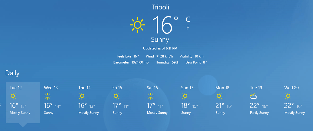 | طرابلس | 11 | 15 | امطار متفرقة ورياح نشطة | 11 | 18 | صافية إلى قليلة السحب |