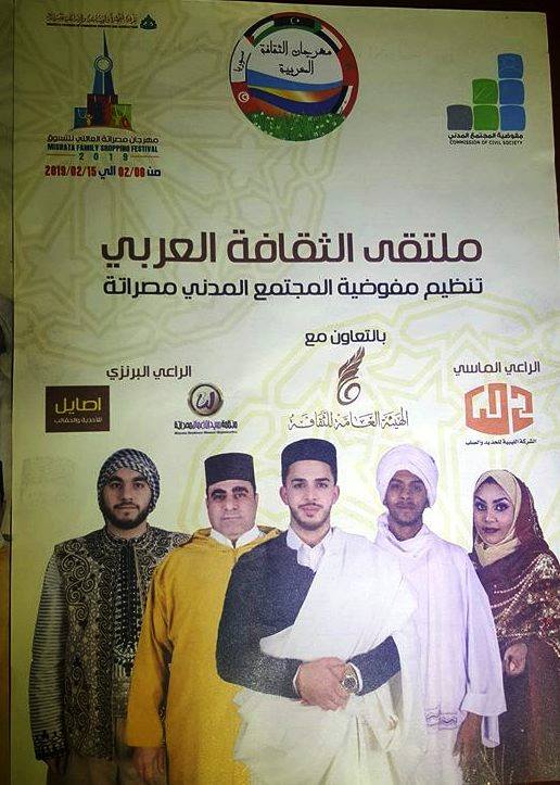 برعاية الهيئة العامة للثقافة المثمتلة في المكتب الثقافي مصراتة وبتنظيم مفوضية المجتمع المدني في المدينة اقيم مساء يوم 14فبراير 2019 بقاعة الشهداء على هامش مهرجان مصراتة العائلي للتسوق حفل اختتام ملتقى الثقافة العربية والذي أستمر طيلة خمسة أيام ..حيث حضر رئيس الهيئة العامة للثقافة السيد حسن أونيس هذا الملتقى وألقى كلمة بالمناسبة هنأ فيها الشعب الليبي على الذكرى الثامنة لثورة فبراير وترحم على الشهداء وتمنى الشفاء للجرحى والعودة للمفقودين و أبدى سعادته بهذه المشاركة من قبل الجاليات العربية وأثنى على الفن الجميل والتراثى الذي قدموه في هذا الملتقى.