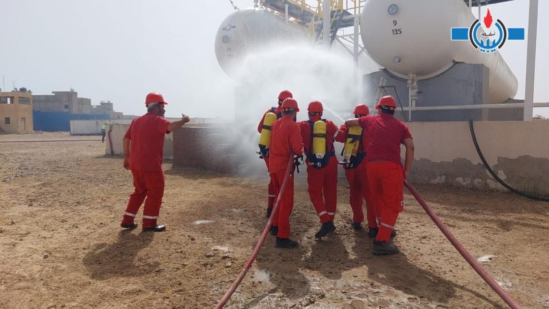 فرق الإطفاء والصحة والسلامة بمستودع الهاني تقوم بتنفيذ عملية محاكاة عملية على أرض الواقع.