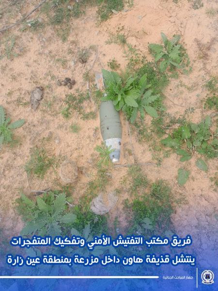 تمكن فريق مكتب التفتيش الأمني وتفكيك المتفجرات التابع لإدارة الشؤون الفنية بجهاز المباحث الجنائية من انتشال قذيفة هاون عيار (60) مم داخل مزرعة بمنطقة عين زارة بالقرب من مسجد فطرة بعد ورود بلاغ من قبل غرفة الجهاز الرئيسية
