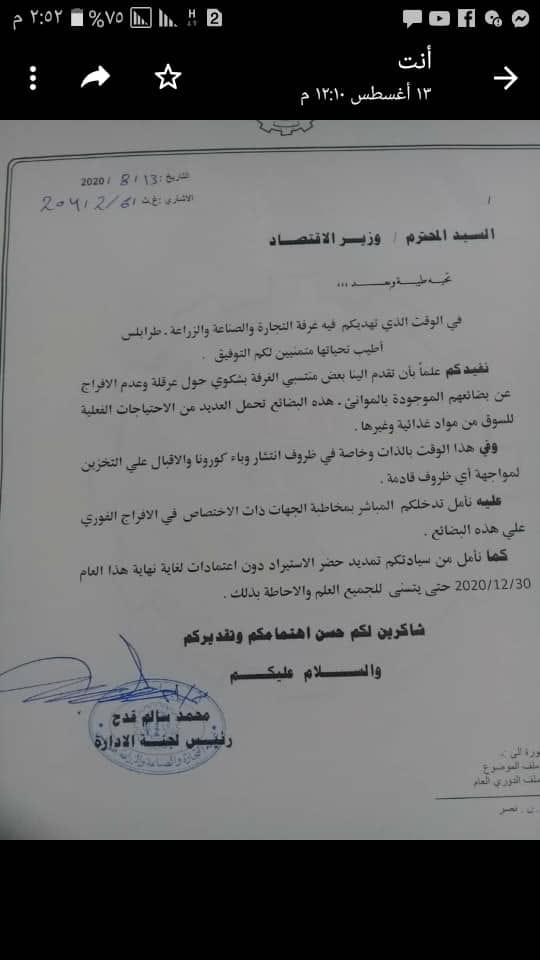 قامت غرفة التجارة والصناعة والزراعة طرابلس بمخاطبة وزارة الاقتصاد والصناعة بالخصوص ، مطالبة إياها بالتدخل لدى باقي الأطراف ذات العلاقة بالموضوع لأجل الإفراج على السلع المحتجزة في أقرب الآجال .