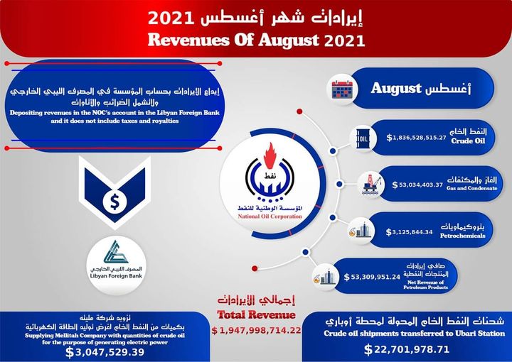تُعّلِن المؤسسة الوطنية للنفـط أن صافي ايرادات شهر اغسطس للعام 2021م من مبيعات النفط الخام والغاز والمكثفات والمنتجات النفطية والبتروكيماويات وصل الى مستويات قياسية مدفوعاً بانتعاش في الاسعار حول العالم ، حيث سجل مستوى 1,836,528,515.27 دولار أمريكي من النفط الخام يليها الغاز والمكثفات والتي وصلت الى 53,034,403.37 دولار امريكي.