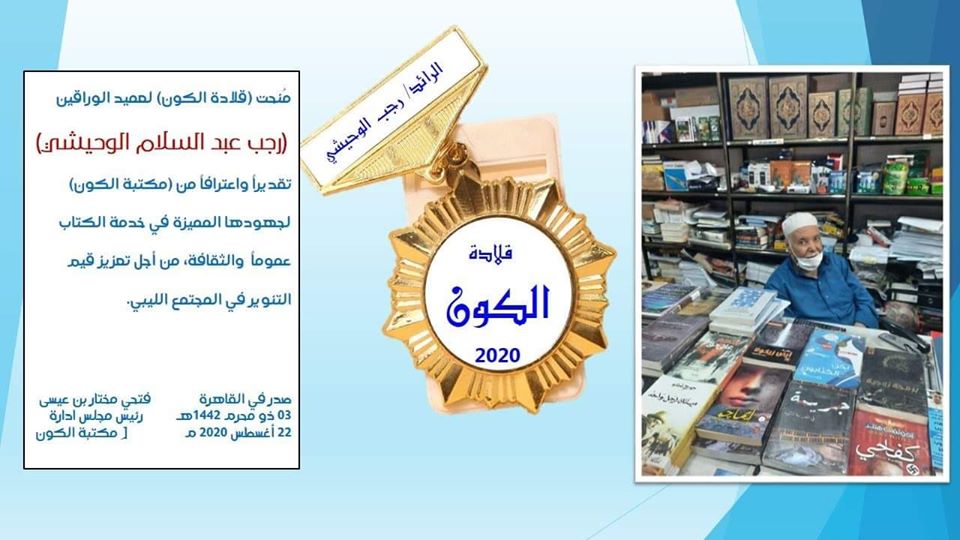 بكل مشاعر الحب والامتنان تعلن مؤسسة الكون الثقافية (مكتبة الكون) عن منح (قلاد ة الكون) في إصدارها الرابع لعميد الوراقين “باعة الكتب والصحف” في طرابلس الحاج (رجب عبد السلام الوحيشي)، وذلك تقديرا لدوره المميز في نشر الوعي والثقافة من خلال توفير الكتاب والصحيفة طيلة 65 عاما دون توقف.