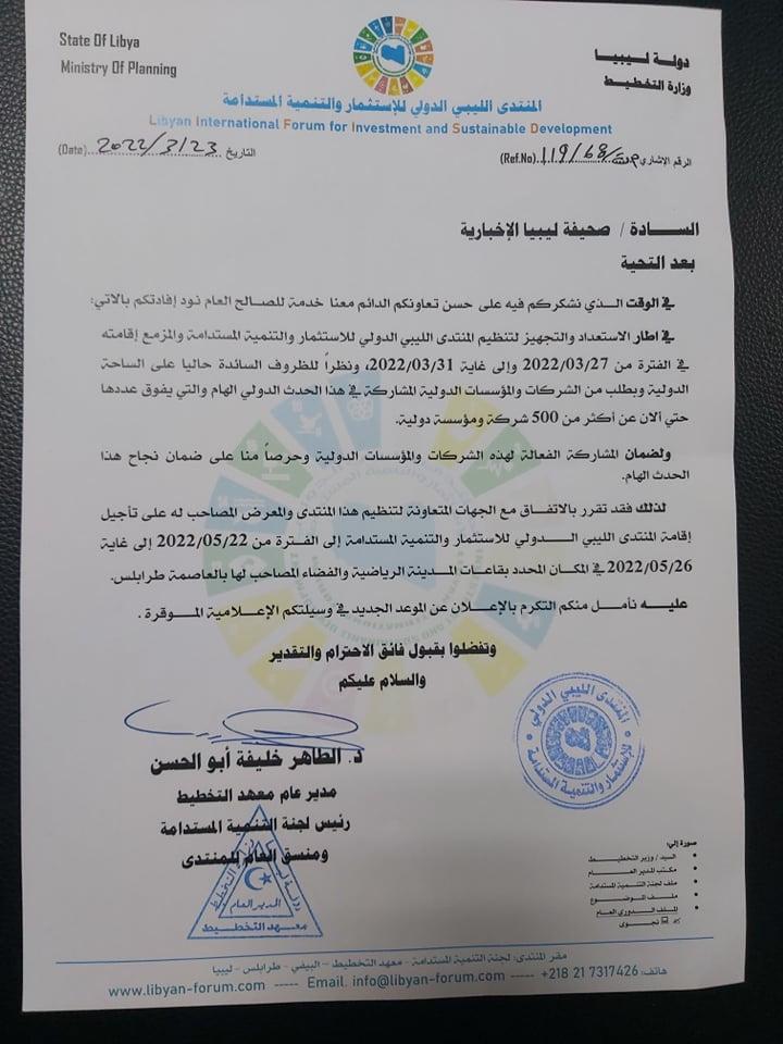في إطار الاستعداد والتجهيز لتنظيم المنتدى الليبي الدولي للاستثمار والتنمية المستدامة والمزمع إقامته في الفترة من 27 إلى31 مارس 2022، ونظراً للظروف السائدة حاليا على الساحة الدولية وبطلب من الشركات والمؤسسات الدولية المشاركة في هذا الحدث الدولي الهام والتي يفوق عددها حتى الآن أكثر من 500 شركة ومؤسسة دولية.