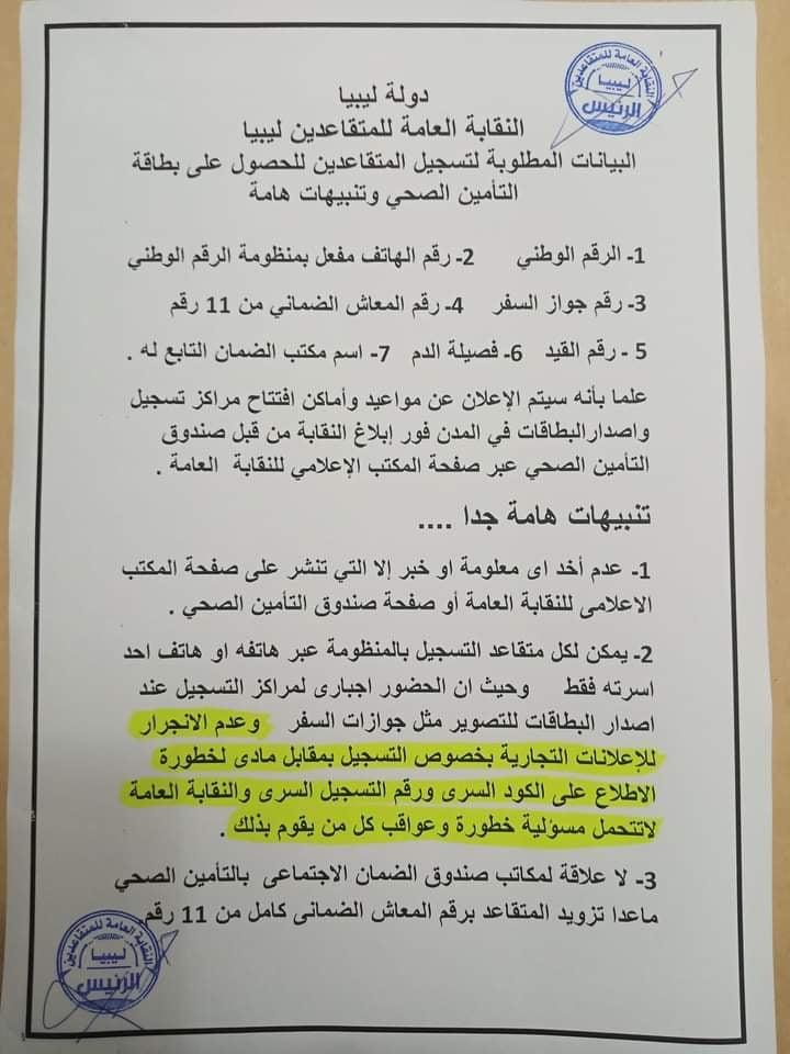 تنوه إدارة صندوق التامين الصحي، والنقابة العامة للمتقاعدين في ليبيا إلى عدم تكليف أي مكاتب خاصة لتسجيل المتقاعدين بمنظومة التأمين بمقابل مادي، وسوف يتم الإعلان خلال الأيام القادمة عن افتتاح مراكز التسجيل وإصدار البطاقات بالمدن، والتنبيه على خطورة هذا العمل نظرا لسرية الكود ورقم التسجيل.