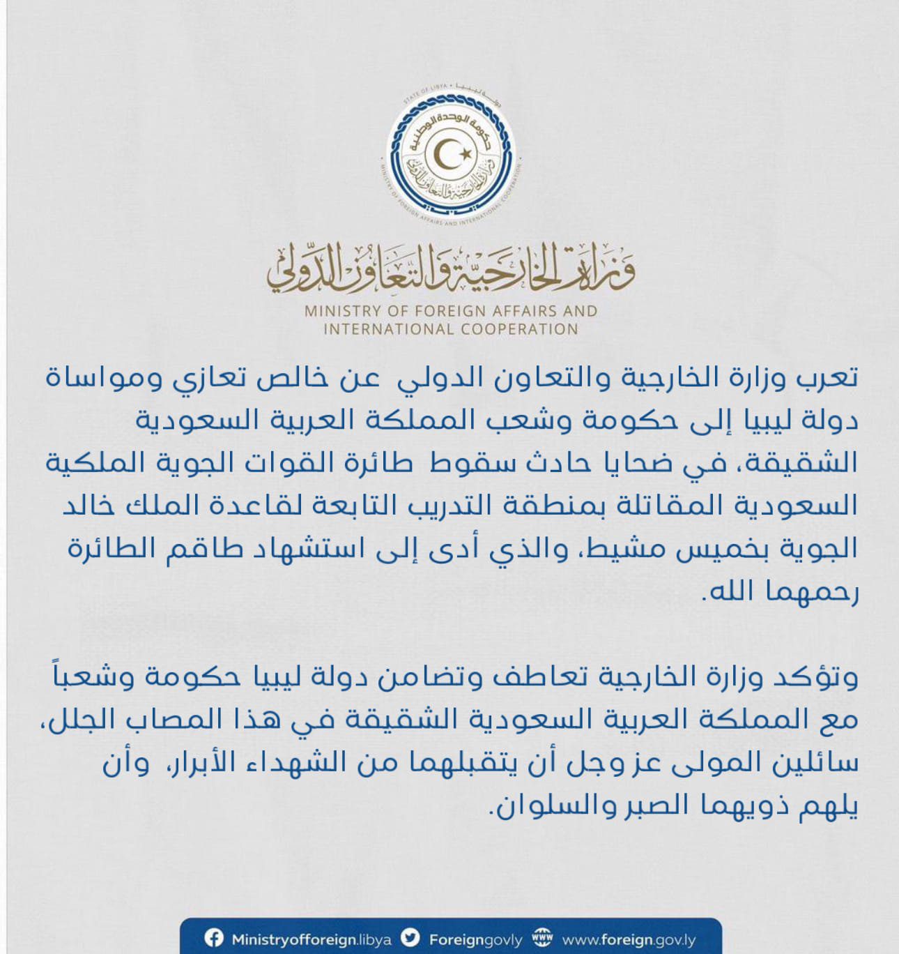 أعربت دولة ليبيا عن خالص التعازي والمواساة إلى حكومة وشعب اللمملكة العربية السعودية في ضحايا حادث سقوط طائرة القوات الجوية الملكية السعودية المقاتلة بمنطقة التدريب التابعة لقاعدة الملك خالد الجوية بخميس مشيط، والذي أدى إلى استشهاد طاقم الطائرة رحمهما الله.