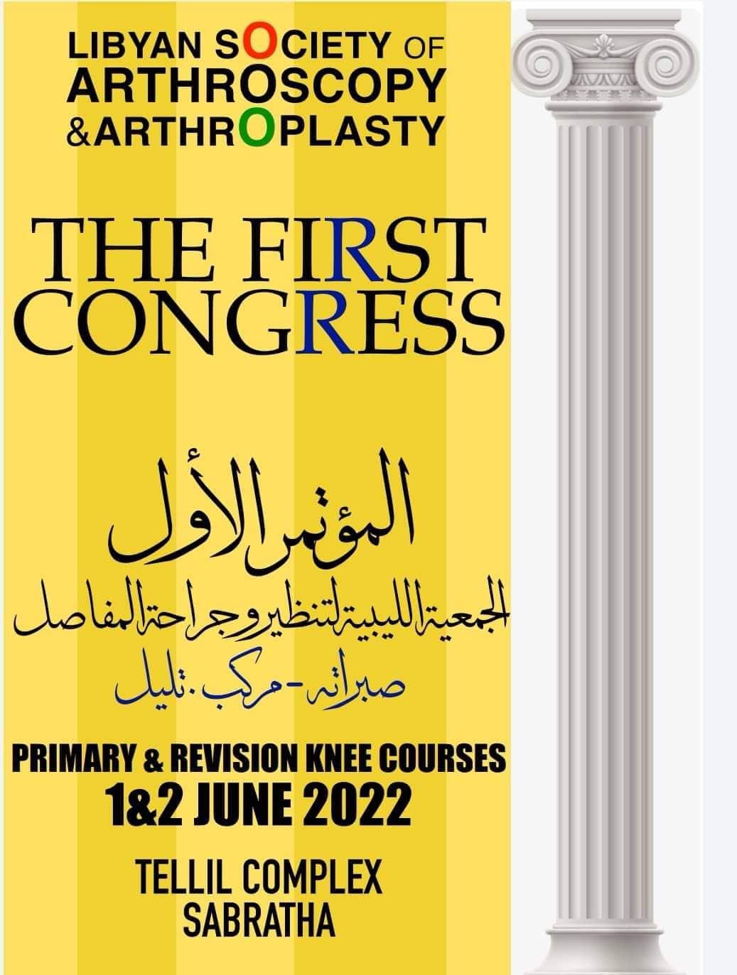 تقيم الجمعية الليبية لجراحة وتنظير المفاصل المؤتمر الأول حول مفصل الركبة، يومي 1_2 يونيو 2022, بمركب تليل السياحي بمدينة صبراتة، بحضور نخبة من أطباء العظام من كل مستشفيات ليبيا ، تقدم فيه أوراق علميه بحثيه لنخبة من الأساتذة في جراحة العظام وورش عمل تقنية في مبادئ واساسيات زراعه مفصل الركبه الأولي وعمليات الاعادة الأسباب والتقنية.