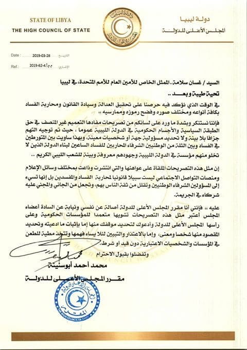 وتابع أوسنينة في رسالته ” أصالة عن نفسي و نيابة عن أعضاء المجلس أعتبر مثل هذه التصريحات تشويها متعمدا للمؤسسات الحكومية وعلى رأسها المجلس الأعلى للدولة “.