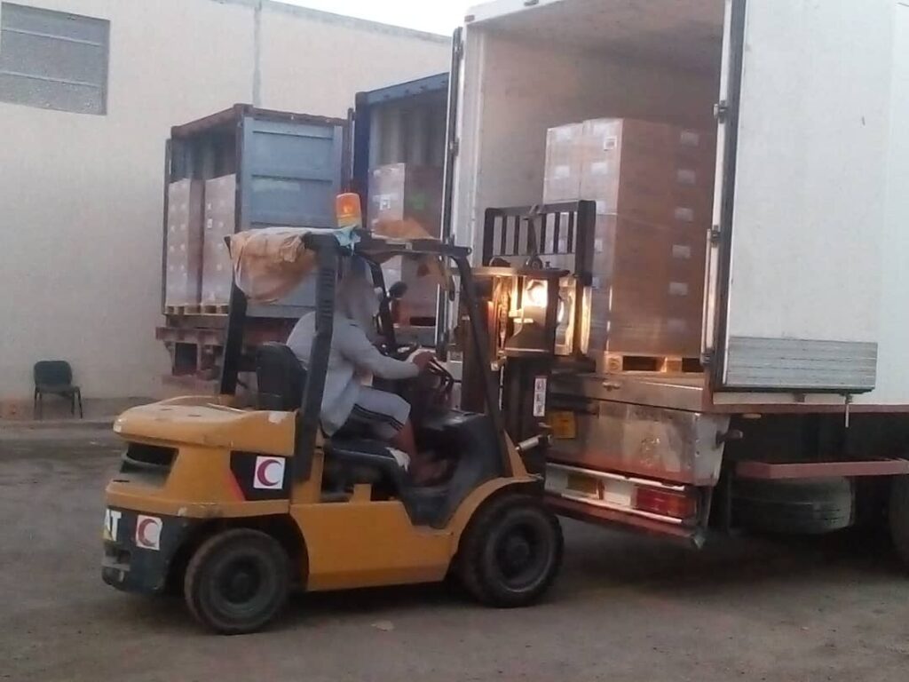 وفور تفريغ الشحنة باشر المسؤولين في المخازن توزيعها باستلام مندوبي مراكز غسيل كل من ” الشط ، جنزور، ، مصراته، تاجوراء”، مخصصاتهم.