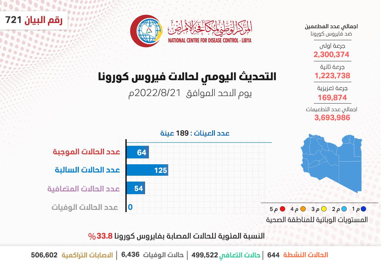 وجاء في التحديث اليومي للوضع الوبائي المحلي لفيروس كورونا المستجد ليوم الاحد الموافق 21 أغسطس 2022 م وفقا للبيان رقم (721) .