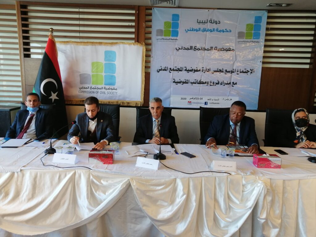 ثم تحدث المدير التنفيذي لمفوضية المجتمع المدني د.(صلاح عبد السلام محمد) ، مرحبا بالحضور ، وأكد أن هذا الاجتماع الموسع  يعنبر لقاء بمختلف مناطق ليبيا من خلال أكثر من 50 فرع ومكتب ممثلين في الرؤساء والمدراء الذين كانوا في الموعد رغم بعد المسافات وصعوبة السفر والتنقل هذه الايام وفي ظل جائحة كرونا ، وذلك حتى نتمكن معهم وبوجودهم في تقريب وجهات النظر وإعداد استراتيجيات تتوافق الرؤية والرسالة والأهداف التي قامت على أسسها المفوضية ، ثم أشار الي البنود التي سيتم مناقشتها في الاجتماع .