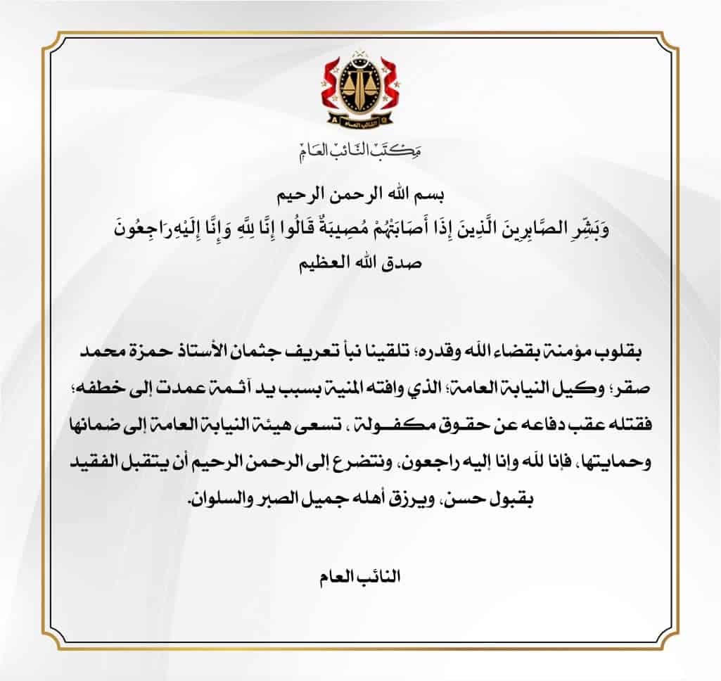 مكتب النائب العام يعلن مقتل وكيل نيابة ( حمزة صقر ) بعد اختطافه من قبل مجهولين .