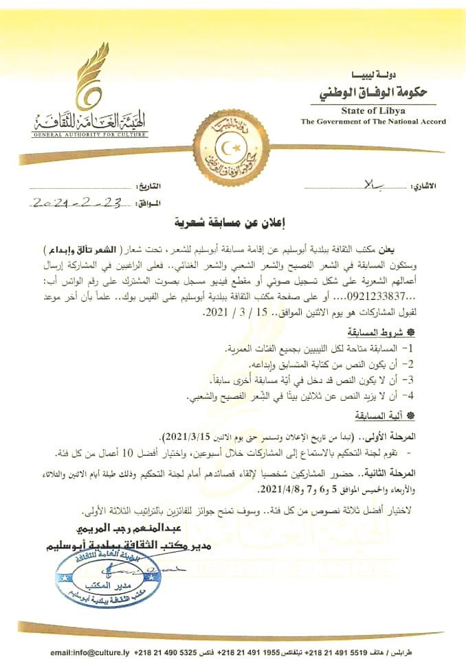 أعلن مكتب الهيئة أبو سليم عن تنظيم مسابقة بعنوان “الشعر تألق وإبداع” وذلك خلال منتصف الشهر الجاري .