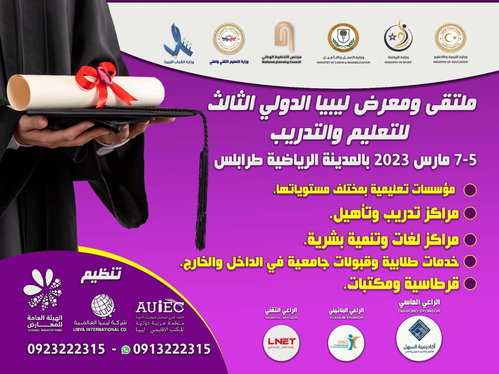 تجري هذه الأيام الإستعدادات لأنطلاق فعاليات ملتقى ومعرض ليبيا الدولي الثالث للتعليم والتدريب المزمع عقده خلال الفترة من 5-7 مارس القادم في المدينة الرياضية طرابلس والذي تشرف عليه وزارة التعليم التقني والفني بالتعاون مع وزارة التربية والتعليم ووزارة العمل والتأهيل ووزارة الرياضة ووزارة الشباب ومجلس التخطيط الوطني.