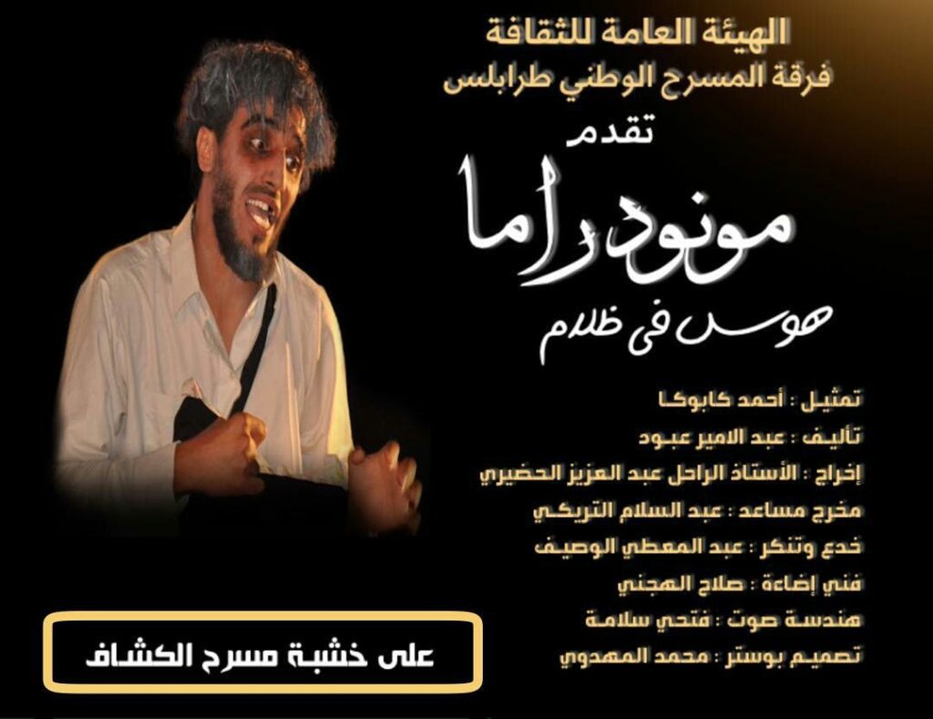 قدم الفنان احمد كابوكا كياء الجمعة بمسرح الكشاف العرض المسرحي ” هوس في ظلام “. للمخرج الراحل عبد العزيز الحضيري و تأليف الفنان عبد الأمير عبود، وإنتاج الهيئة العامة للثقافة، والمسرح الوطني طرابلس، ولعب دور البطولة فيها الفنان احمد كابوكا