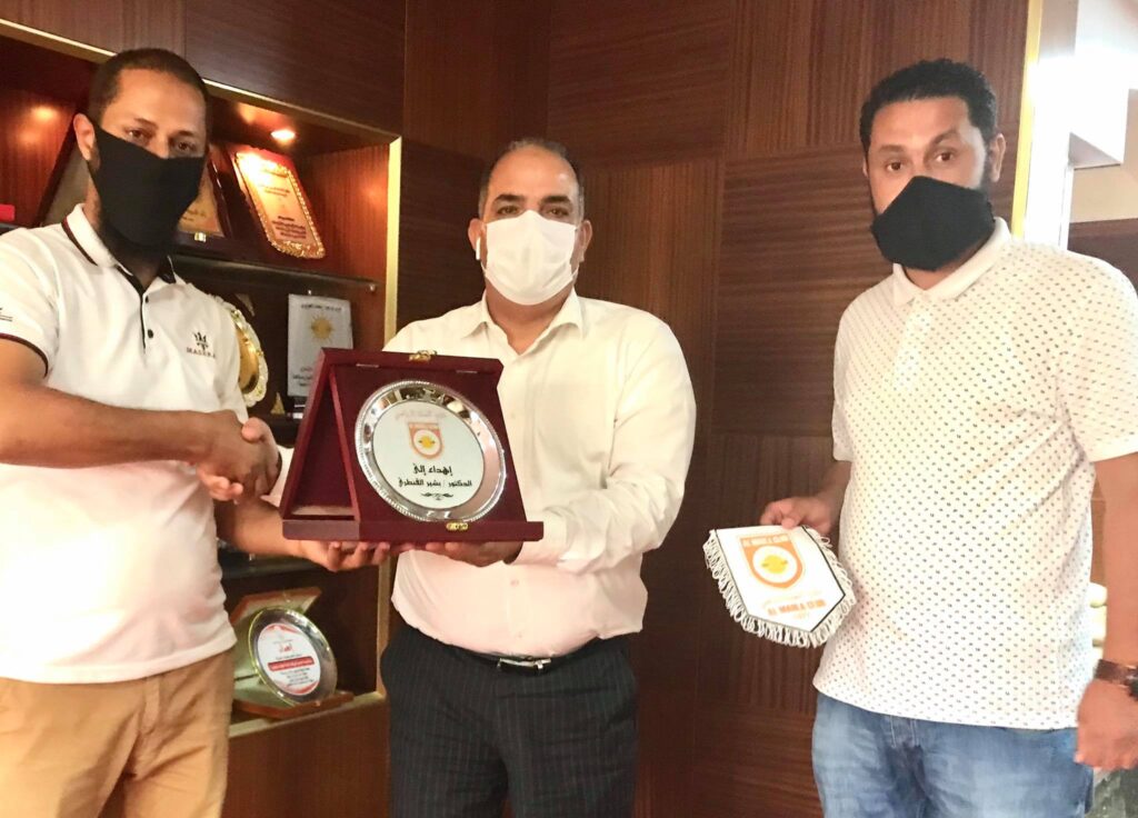 حيث التقيا برئيس الهيئة بالدكتور بشير القنطري وتحاورا معه حول سير العمل بالمشروعات الجاري تنفيذها بالنادي والتي منها الملعب الرئيسي المُعشب طبيعياً وكذلك الملعب الجانبي ذي الأرضية الصناعية.