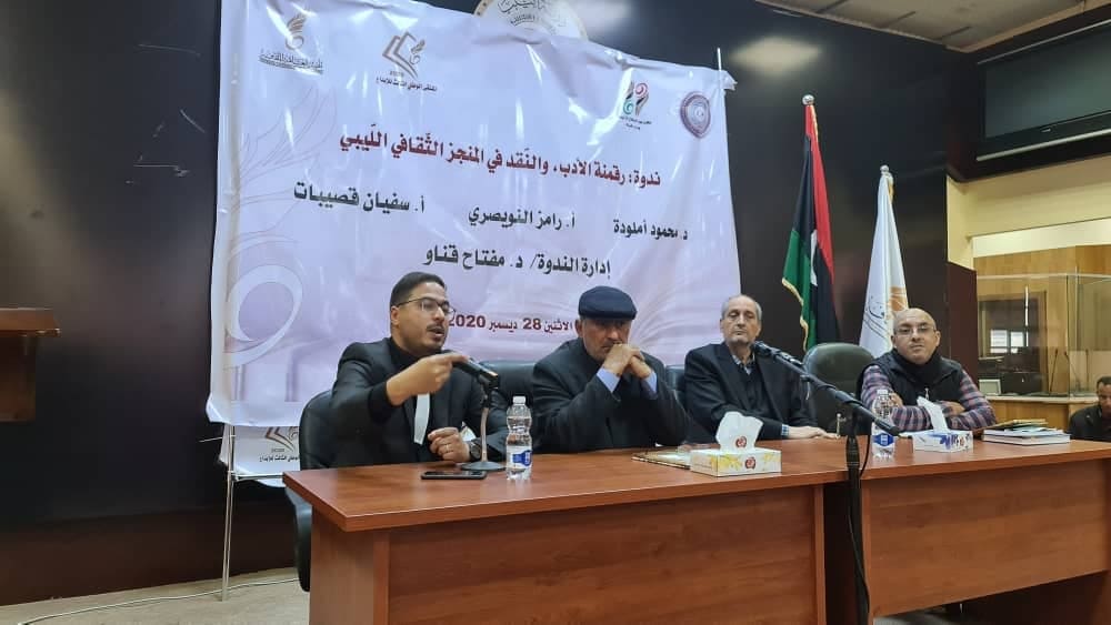 ضمن فعاليات الملتقى في يومه الخامس التئمت ندوة ” رقمنة الأدب والنقد في المنجز الثقافي الليبي ” ظهر يوم الاثنين 28 ديسمبر2020م بقاعة عمر المختار بأرض معرض طرابلس الدولي بإدارة الدكتور مفتاح قناو ومشاركة كل من د.محمود أملودة وأ.رامز النويصري وأ.سفيان قصيبات .