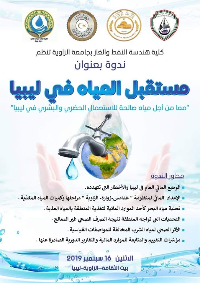 نظمت كلية هندسة النفط والغاز ندوة علمية عن مستقبل المياه في ليبيا والأخطار التي تهدد الوضع المائي فيها وذلك يوم الاثنين 16 سبتمبر 2019 ببيت الثقافة بمدينة الزاوية من الساعة التاسعة صباحا وحتى الساعة الثانية ظهرا .