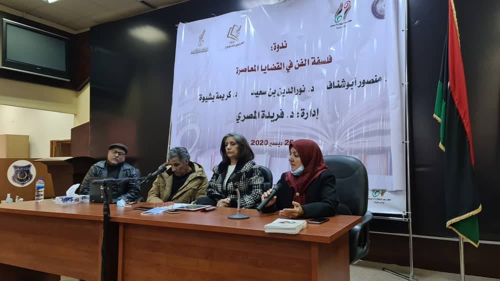 أقيمت الندوة الفكرية حول فلسفة الفني القضايا المعاصرة بقاعة عمر المختار بمعرض طرابلس الدولي صباح السبت الماضي، وذلك ضمن الأنشطة الثقافية للملتقى الوطني الثالث للإبداع الذي تشرف عليه الهيئة العامة للثقافة ، وأدارت الندوة الدكتورة فريدة العلاقي وشاركت فيها الدكتورة كريمة بشيوة والأستاذ منصور ابوشناف ودكتور نورالدين الورفلي..