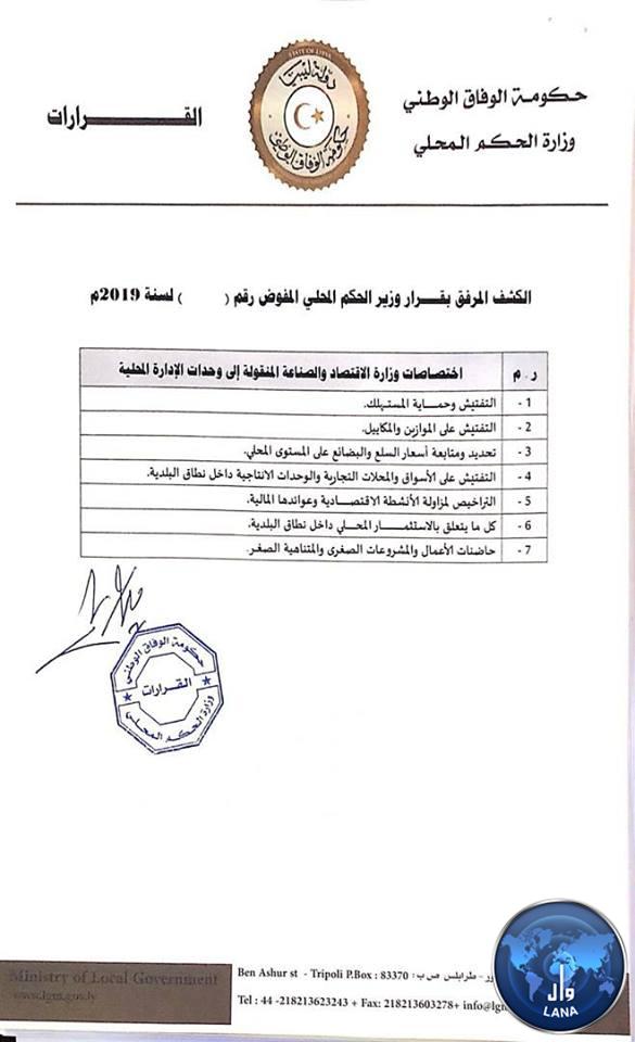 تنفيذا لمحضر الاتفاق بين وزارتي ” الاقتصاد والصناعة ” و” الحكم المحلي ” بنقل الاختصاصات إلى وحدات الإدارة المحلية . أصدر وزير الحكم المحلي القرار رقم (152) لسنة 2019 ميلادية ،بنقل اختصاصات وزارة الاقتصاد والصناعة إلى الوحدات الإدارية المحلية بالبلديات . وبوجب نقل الاختصاصات أصبح بإمكان البلديات تأسيس مشروعات اقتصادية تلائم احتياجات الوحدات المحلية وحاجات المواطنين فيها، وتشجيع الاستثمارات المحلية .