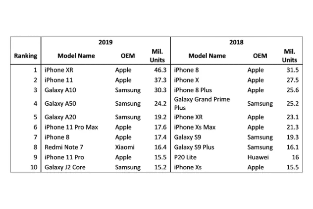 فيما جاءت قائمة الهواتف العشرة الأكثر مبيعاً في 2019 مشابهة للأرقام أعلاه باحتلال هواتف آبل وسامسونج المراكز الأولى كما يظهر الجدول التالي والذي يوضح المقارنة بين العامين السباقين 2018 و2019 مع تحقيق آيفون 11 المرتبة الثاثية بعد ثلاثة شهور فقد من إطلاقه: