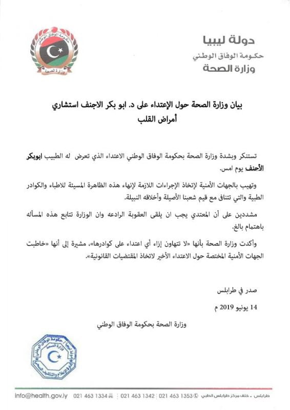 استنكرت وبشدة وزارة الصحة بحكومة الوفاق الوطني الاعتداء الذي تعرض له الطبيب أبو بكر الأجنف يوم أمس.