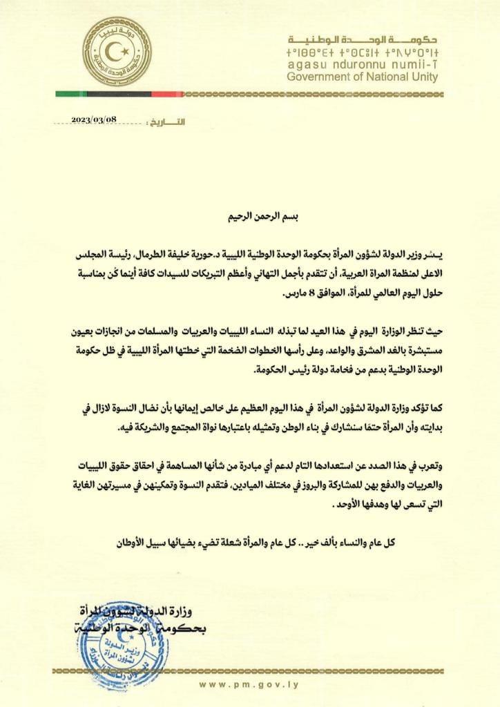 تقدمت الناطقة الرسمية باسم وزارة الدولة لشؤون المرأة ميار صلاح الدين ، للنساء الليبيات والعربيات بأجمل التهاني وأعظم التبريكات بمناسبة حلول اليوم العالمي للمرأة، الموافق 8 مارس الجاري، قائلين لهُن :