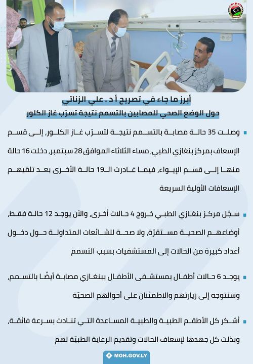 قام وزير الصحة ” علي الزناتي ” بتفقد الحالة الصحية للمصابين بحالات تسمم بغاز الكلور بمركز بنغازي الطبي ومستشفى طب وجراحة الأطفال بنغازي.