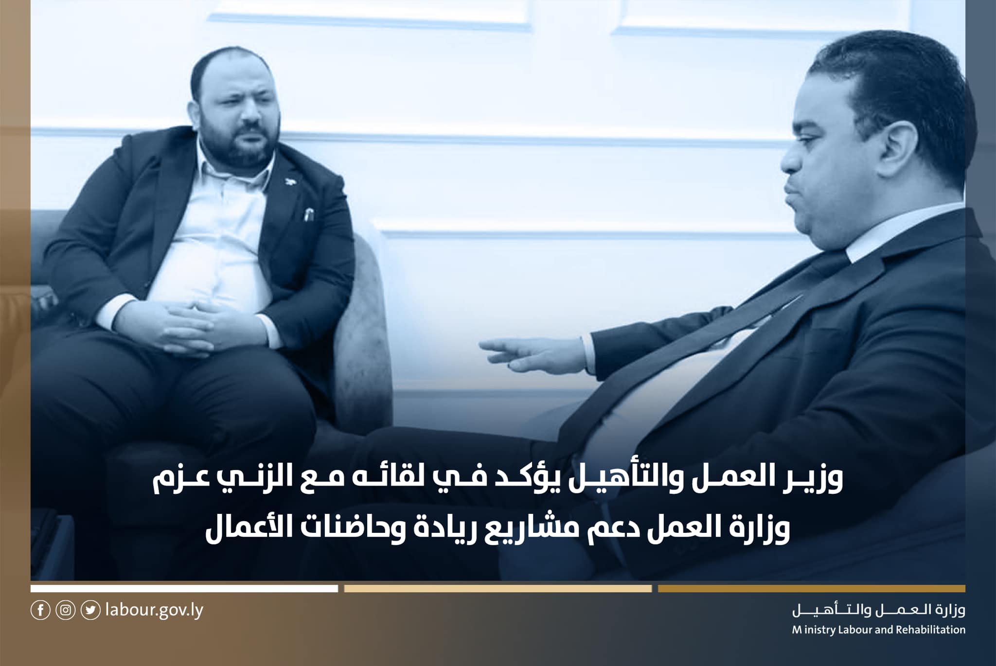 أكد معالي وزير العمل والتاهيل المهندس علي العابد الرضا خلال لقائه معالي وزير الشباب السيد فتح الله الزني في مكتبه ظهر اليوم ، عزم وزارة العمل على دعم مشاريع ريادة وحاضنات الأعمال عبر التدريب والدعم، وعلى التعاون والعمل المشترك مع وزارة الشباب.