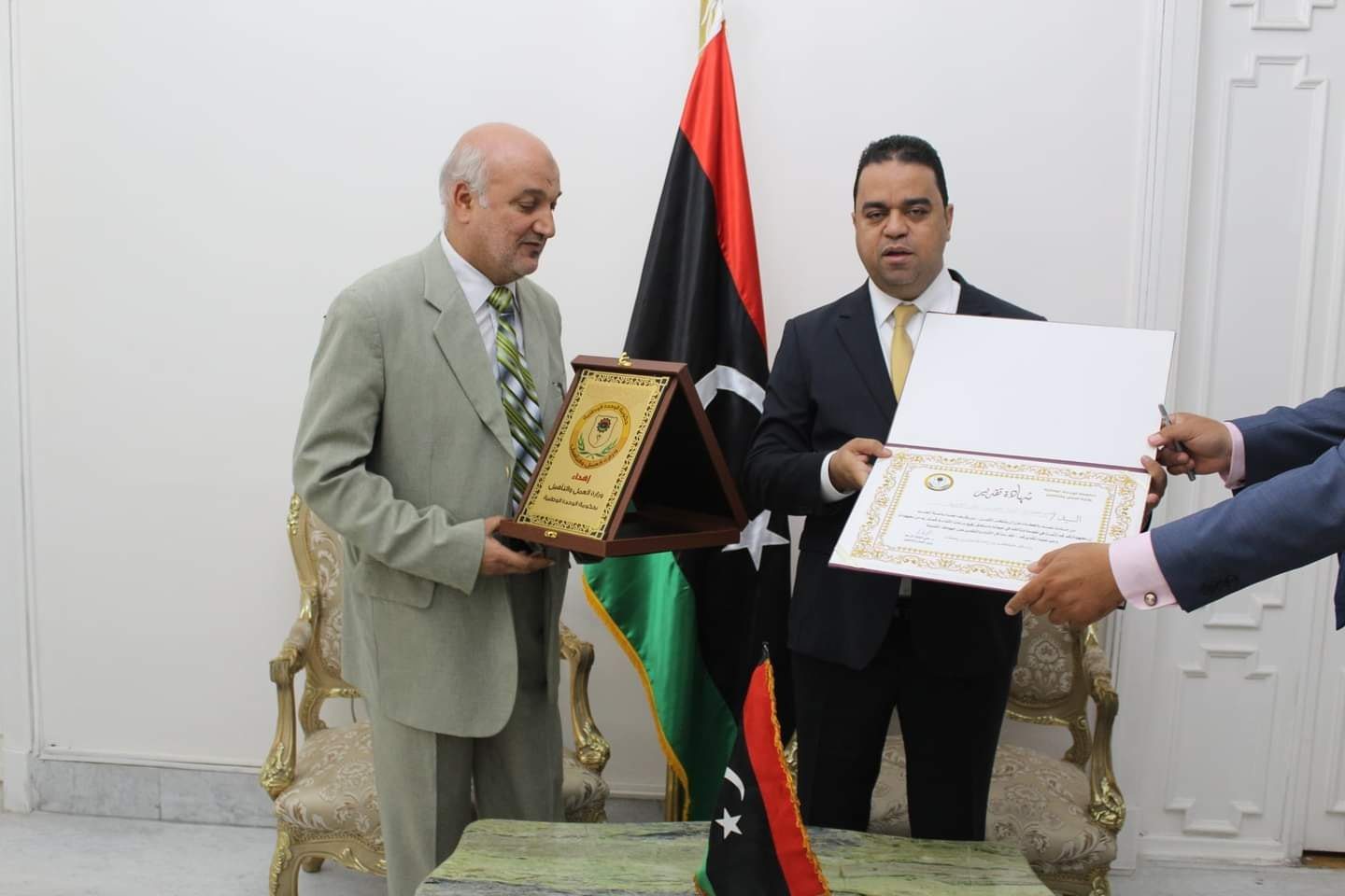 وفي نهاية الزيارة قام الوزير بتقديم درع وزارة العمل والتأهيل وشهادة تقدير لأعضاء البعثة تسلمها السيد القائم بالأعمال المكلف .