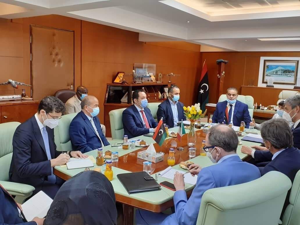 عقد السيد وزير المواصلات بحكومة الوحدة الوطنية اليوم الثلاثاء الموافق 18 / 5 / 2021 م اجتماعا مع سعادة السيد / جوزيبي بوتشينو سفير جمهورية ايطاليا لدى ليبيا رفقة السيد / ميكائيلي روسي المستشار التجاري بالسفارة و وفد رفيع المستوى يمثل هيئة الطيران المدني الايطالي و كذلك السيد / لويجي ديسوري رئيس مجلس إدارة الشركة المنفذة لمطار طرابلس الدولي و حضر من وزارة المواصلات كلا من :- السيد / د. محمد بيت المال -رئيس مصلحة المطارات – السيد / م. مصطفى عبد الحميد عمار- رئيس مصلحة الطيران المدني- السيد / م. سامي العبش – رئيس جهاز تنفيذ مشروعات المواصلات- السيد / عادل بخيت ابراهيم – مدير مكتب التعاون الفنيو تمحور اللقاء الذي جمع الوفدين حول أخر المستجدات بخصوص المشاريع المراد البدء في تنفيذها و كذلك حول تسهيل الاجراءات الفنية و الامنية و اللوجيستية لتنفيذ المشاريع و تتمثل هذه المشاريع في :- مشروع تنفيذ مطار طرابلس الدولي- مشروع تنفيذ الطريق السريع ( راس اجدير – امساعد )- تدريب العناصر الوطنية في مجال السلامة الجوية و التفتيش الامني للمطارات و كذلك توفير الاحتياجات الضرورية لتشغيل المطارات و صيانتها . و بعض المشاريع الاخرى.كما قام الوفد رفقة المهندس سامي العبش رئيس جهاز تنفيذ مشروعات المواصلات بزيارة لموقع مطار طرابلس الدولي للوقوف على الاحتياجات اللازمة للشروع في التنفيذ من قبل الشركة الايطالية .